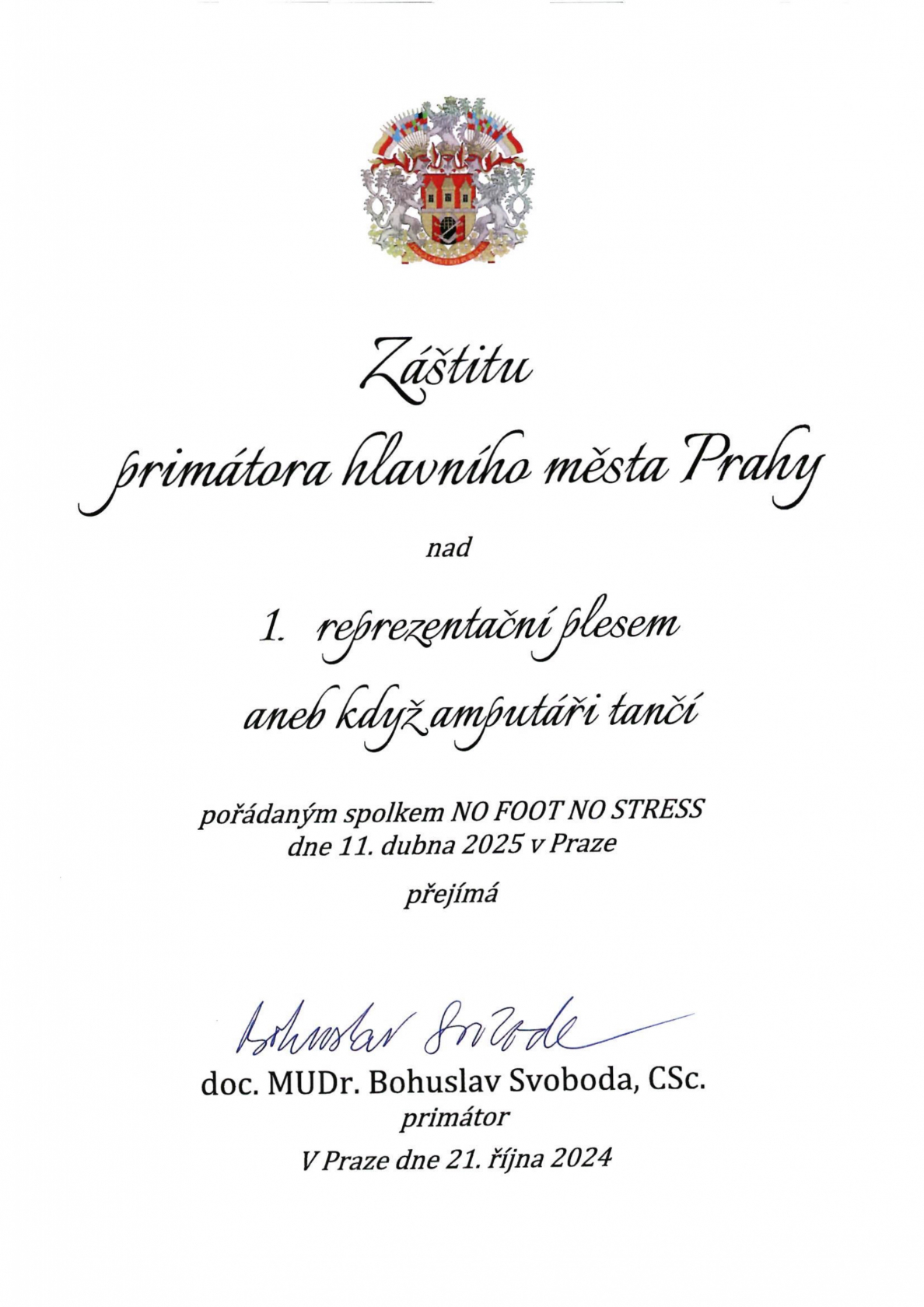 Srdečně vás zveme na 1. reprezentační ples No Foot No Stress aneb amputáři tančí. Uskuteční se 11. 4. 2025 od 19:00 v Kongresovém centru Praha.